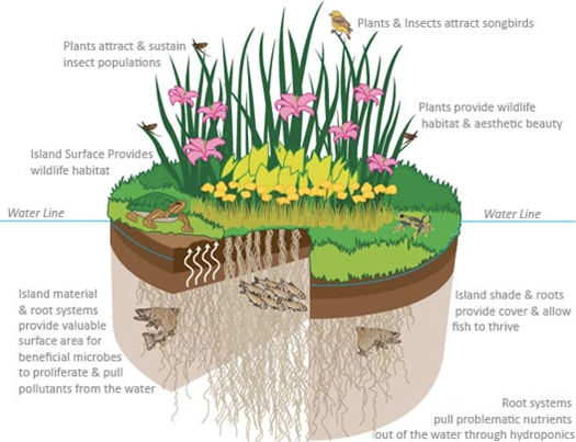百奧源®浮動濕地能夠在不同水體中構建適宜的生境平臺,充分恢復和發(fā)揮水體自身的生態(tài)功能,其主要作用的機制來源于微生物、植物、水生生物和修復生態(tài)圈的綜合作用。